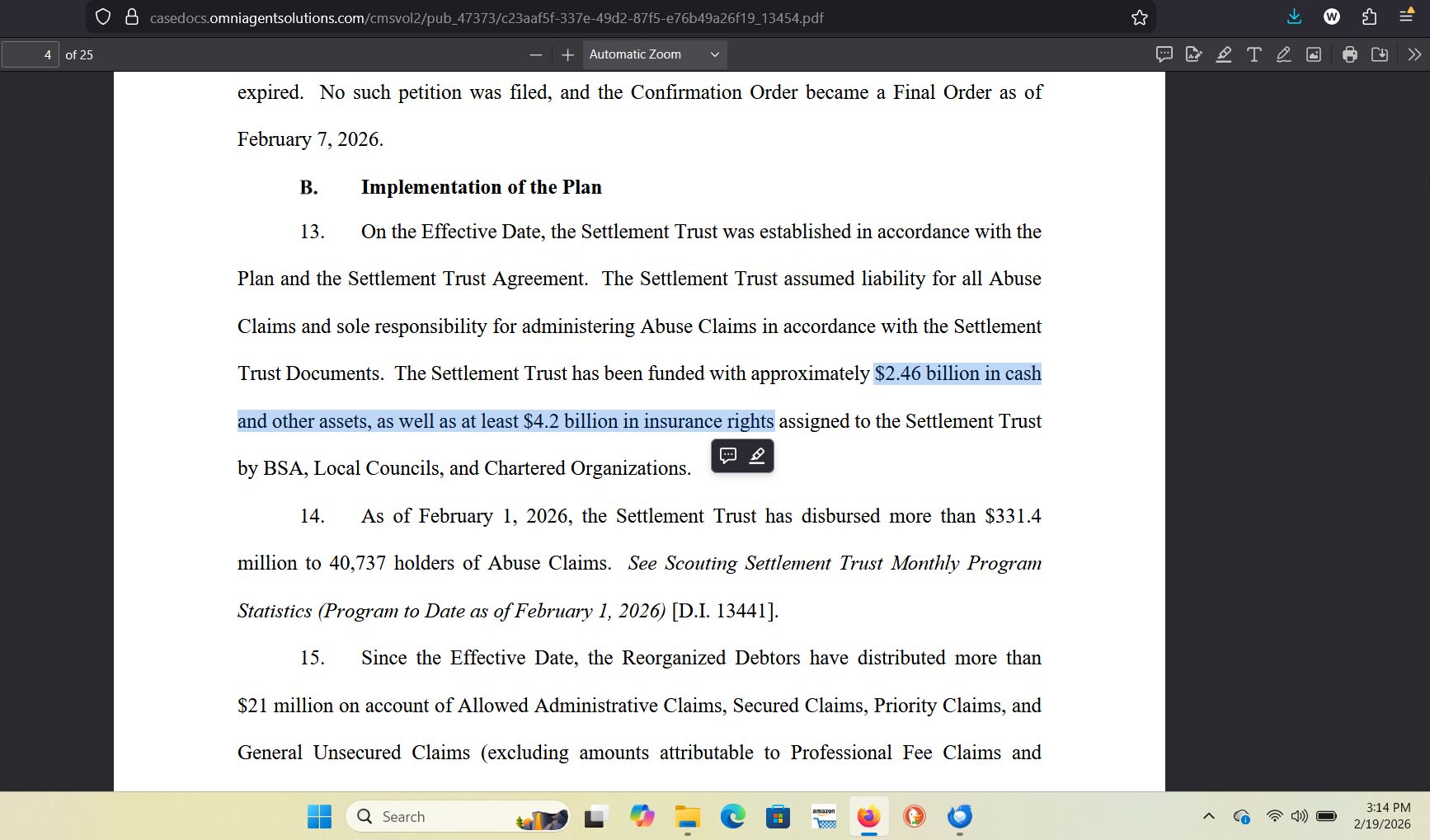 The Settlement Trust has been funded with approximately $2.46 billion in cash and other assets, as well as at least $4.2 billion in insurance rights assigned to the Settlement Trust by BSA, Local Councils, and Chartered Organizations. Implementation of the Plan 13. On the Effective Date, the Settlement Trust was established in accordance with the … Read more