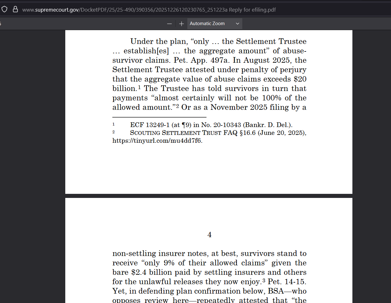 So essentially the Trust put out a false statement yesterday! “As a result of the denial of the petition by the Supreme Court, the Order confirming the BSA Plan is now final.” From their email update dated 1/12/2026. Because today there words are “On January 12, 2026, the Supreme Court denied the Survivors’ request for … Read more